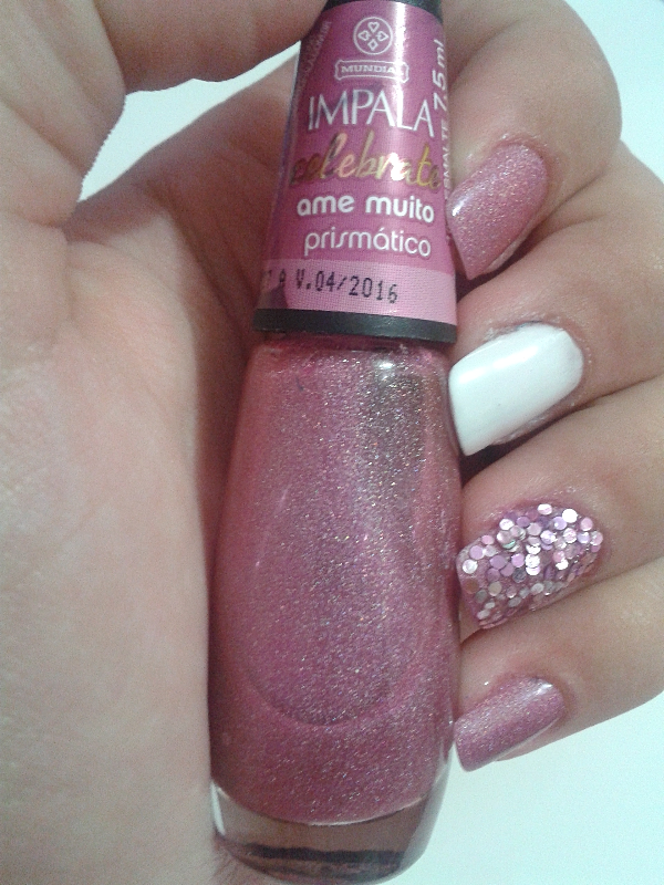 Minha mani dessa semana é meio diferente, no dedo do meio fiz uma cor neutra, o branco da Impala para combinar e no dedo anelar, ao inves de colar um adesivo, inovei com lantejoulas de unhas no formato redondo.